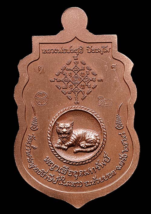 1 ใน 90 เหรียญเสมาพญาเสืออุดมทรัพย์ พระอาจารย์ประสูติ (หลวงพ่อประสูติ) วัดในเตา จ.ตรัง เนื้อทองแดงซาตินเพ้นท์ขอบพญานาคจีวรทอง เลขสวยหลักเดียวNO.8 (เลขแห่งความร่ำรวย) สวยมากครับ