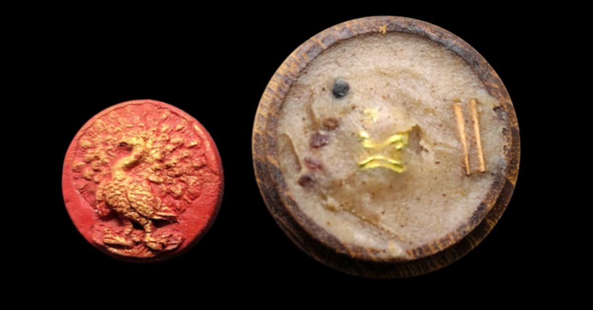 พญายูงคำ รุ่นแรก เนื้อแดงปัดทอง และ ตลับไม้สีผึ้งเนื้อหอม รังผึ้งร้าง ขวางเดือนขวางตะวัน รุ่นแรก ฝังอิ่น ตะกรุด ในเมตตาบารมี เจ้าปู่จั่นต่า กาวิสาละ พญานกยูง ขนาดเท่าเหรียญสิบบาท