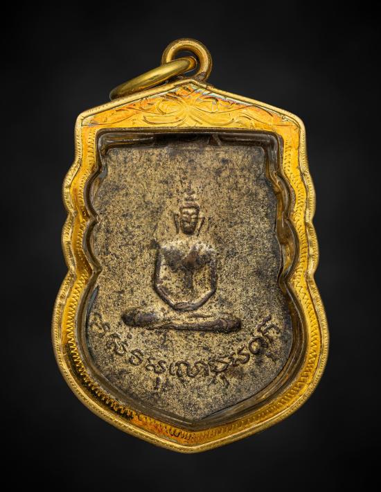 เหรียญพ่อขุนเม็งรายมหาราช พิมพ์หลังพระพุทธ เนื้อทองแดงกะไหล่ทอง ปี 2496 รุ่นแรก จ.เชียงราย เลี่ยมกรอบทอง 65%