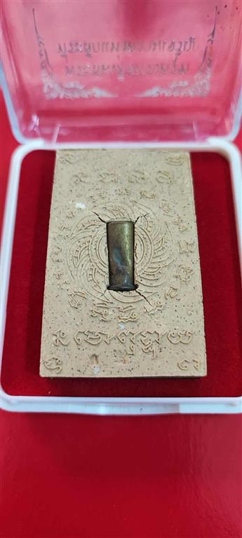 พระสมเด็จทรงครุฑ เนื้อเหลืองขาว ฝังเม็ดแร่ มีเส้นเกศาหลวงปู่ผาดโรยด้านหน้า ด้านหลังฝังปลอกลูกปืน กดโค้ดเป็นสำคัญ