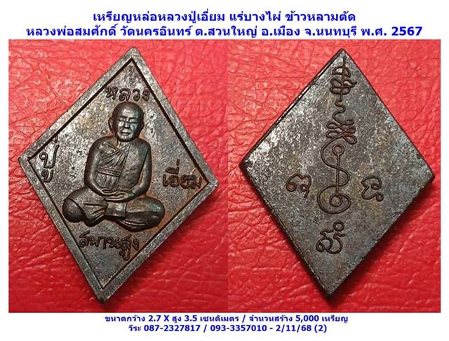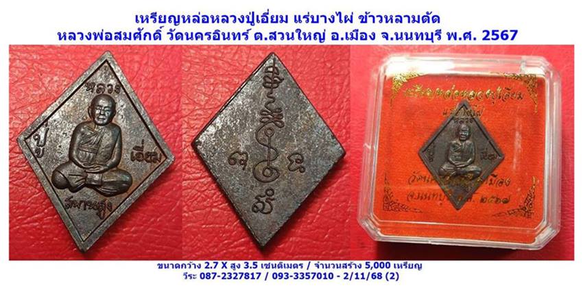 เหรียญหล่อหลวงปู่เอี่ยม แร่บางไผ่ ข้าวหลามตัด หลวงพ่อสมศักดิ์ วัดนครอินทร์ ต.สวนใหญ่ อ.เมือง จ.นนทบุรี พ.ศ. 2567