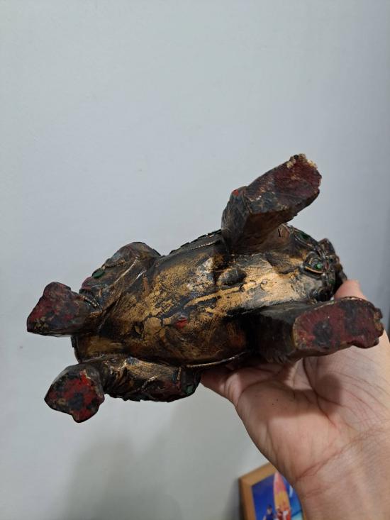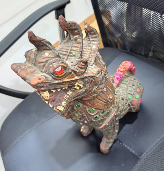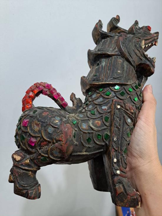 ราชสีห์ หรือ สิงห์ แกะจากไม้ ขนาดตัวสูลง 12 นิ้ว ทำจากไม้ทั้งตัว ฝังกระจกสี ไม่ทราบที่ ได้บ้านๆมาครับ