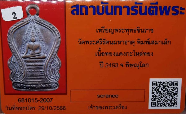 เหรียญพระพุทธชินราช วัดพระศรีรัตนฯ พิมพ์เสมาเล็ก เนื้อทองแดงกะไหล่ทอง ปี2493 จ.พิษณุโลก + บัตร G-pra สภาพเดิมค่ะ
