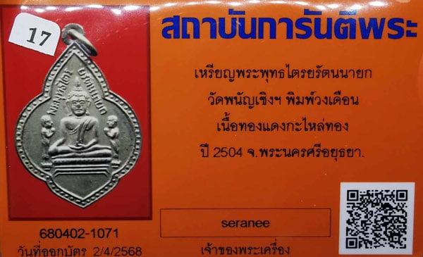 เหรียญพระพุทธไตรยรัตนนายก วัดพนัญเชิงฯ พิมพ์หลังวงเดือน เนื้อทองแดงกะไหล่ทอง ห่วงเดิม ปี2504 จ.พระนครศรีอยุธยา + บัตรG-pra สภาพสวยเดิมค่ะ |