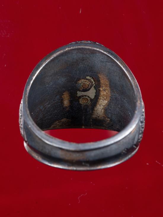 แหวนหน้าแหวนรูปเหมือน หลวงปู่ชื้น วัดญาณเสน จ.พระนครศรีอยุธยา เนื้อเงินลงยาสีน้ำเงิน ปี 2545 ตอกโค๊ด ใต้ท้องวงมีจาร |
