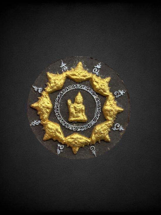 - องค์จตุคามรามเทพประทับนั่งกลางวงยันต์รัศมีพญานาค พร้อมลายอักขระจารึกโดยรอบ ปิดทองเสริมมงคล