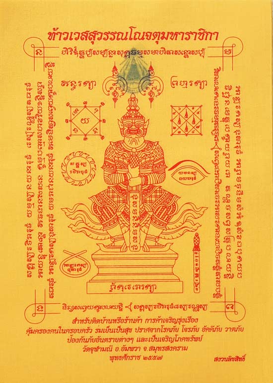 ผ้ายันต์ท้าวเวสสุวรรณโณ วัดจุฬามณี หลวงพ่ออิฎฐ์ ปั๊มตรายางวัดจุฬามณีขนาดA4 ปี2557 พื้นสีเหลืองตัวหนังสือสีแดง |