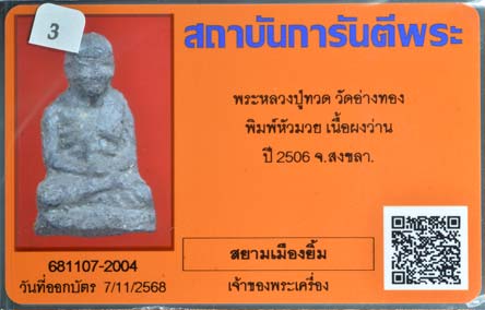 พระหลวงปู่ทวด วัดอ่างทอง พิมพ์หัวมวย เนื้อผงว่าน ปี2506