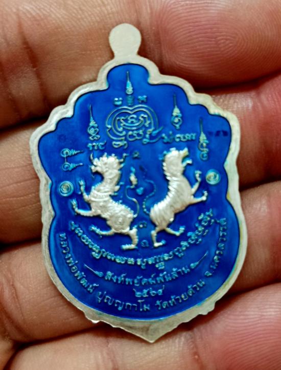 หลวงพ่อพัฒน์ เสมาสิงห์พยัคฆ์พันล้าน เนื้อเงินลงยาฟ้า ขอบเขียว ซุ้มแดง.NO.๒๕๖