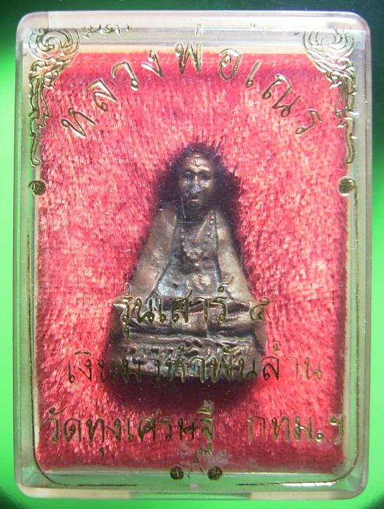 รูปหล่อห่มคลุมหลวงพ่อเณร วัดทุ่งเศรษฐี (ราม 2) กรุงเทพมหานคร รุ่นแรก ปี ๒๕๔๓ รุ่น เสาร์ ๕ เงินมาห้าพันล้าน หลวงปู่หมุน ร่วมปลุกเสก การสร้างพระรุ่นนี้ที่ได้ให้สมัญญาว่า เงินมาห้าพันล้าน เพราะปี 2543 เป็นปีเสาร์ ๕ เศรษฐกิจประเทศไทยย่ำแย่มาหลายปีแล้ว เพื่อเป็นการทวนกระแสดังกล่าว จึงตั้งชื่อพระรุ่นนี้ว่า เงินมาห้าพันล้าน เพื่อให้คนที่นำไปบูชาจะได้มีกำลังใจในทางที่ดี และจะได้อยู่เสมอว่า พระของเราองค์หนึ่งราคาตั้งห้าพันล้าน ก็จะได้มีความอุ่นใจ เป็นมงคลและได้ขวัญกำลังใจในการทำงาน และดำเนินชีวิตต่อสู้ไปไม่ท้อแท้ต่อชีวิตและโชคชะตา พิืธีพุทธาภิเษกในวันพญาวัน คือ วันเสาร์ห้า ขึ้นห้าค่ำ เดือนห้า เกจิิอาจารย์นับร้อยร่วมปลุกเสก เป็นของดีราคาเบา หายากน่าเก็บน่าใช้อีกละคราฟ ***หลวงพ่อเณร ญาณวินโย หรือ พระราชพัฒนโสภณ วัดทุ่งเศรษฐี (ราม 2) เขตประเวศ กรุงเทพฯ หนึ่งในพระเกจินักพัฒนาและมีความสามารถทางวิทยาคมรุ่นใหม่ที่อยู่ในชั้นแนวหน้าของกรุงเทพ เป็นเจ้าอาวาสรูปแรกและรูปปัจจุบัน ผู้ที่เป็นทั้งอาจารย์และดูฤกษ์บวชให้หลวงพ่อเณร ญาณวินโย คือหลวงปู่คำมี วัดถ้ำคูหาสวรรค์ และพระที่นั่งอันดับในงานบวชล้วนเป็นเกจิในยุคนั้นทั้งสิ้น ซึ่งหลวงพ่อเณรก็ได้ศึกษาศาสตร์ต่างๆจากท่านเหล่านั้นด้วย หลวงพ่อเณร ท่านสืบสานวิชาตำหรับหลวงพ่อปาน วัดบางนมโค จาก หลวงปู่ฤาษีลิงขาว (หลวงพ่อช่อ อภินันโท) วัดฤกษ์บุญมี ศิษย์เอกหลวงปู่ปานอีกรูปหนึ่งนอกจากนี้ท่านได้ศึกษาวิชาจากครูบาอาจารย์ท่านต่างๆเช่น หลวงปู่คำมี วัดถ้ำคูหาสวรรค์ จ.ลพบุรี หลวงปู่ผูก วัดเกาะ จ.เพชรบุรี (ศิษย์หลวงพ่อมี วัดพระทรง) หลวงพ่อบุญมี วัดเขาสมอคอน จ.ลพบุรี หลวงปู่คำแสน คุณาลังกาโร วัดป่าดอนมูล จ.เชียงใหม่ หลวงปู่อิน วัดลาดท่าใหม่ จ.จันทบุรี หรือหลวงพ่ออินเทวดา (ศิษย์หลวงปู่จัน วัดนางหนู) หลวงปู่พรหมา เขมจาโร วัดสวนหินผานางคอย จ.อุบลราชธานี หลวงปู่ชื่น วัดตาอี จ.บุรีรัมย์ หลวงปู่ฤทธิ์ วัดชลประทานราชดำริ หลวงปู่โต๊ะ วัดประดู่ฉิมพลี หลวงพ่อใบ วัดกลางบางแก้ว (ศิษย์เอกหลวงปู่เพิ่ม วัดกลางบางแก้ว) หลวงปู่หน่าย วัดบ้านแจ้ง หลวงปู่คร่ำ วัดวังหว้า จ.ระยอง หลวงปู่ชื่น วัดมาบข่า จ.ระยอง หลวงปู่นิด วัดทับมา จ.ระยอง หลวงพ่อช่วย วัดไตรมุก จ.ชลบุรี(ศิษย์หลวงปู่ปาน วัดบางเหี้ย) ครูบาหมวก วัดดอนมูล (ศิษย์ครูบาศรีวิชัย) ฯลฯ ส่วนรูปหล่อรุ่นนี้ถือว่าเป็นอีกหนึ่งวัตถุทมงคลของท่าน ที่สุดยอดพิธี พุทธาภิเษก 9 วัน 9 คืน วันเสาร์ห้า ขึ้นห้าค่ำ เดือนห้า เกจิิอาจารย์นับร้อยร่วมปลุกเสก มา