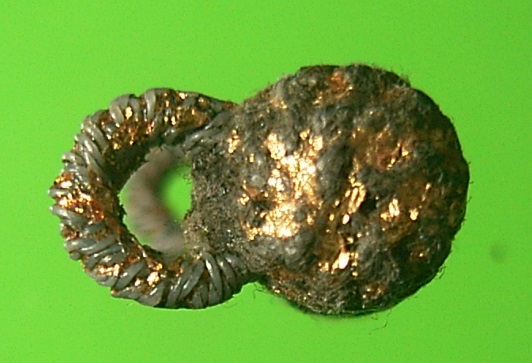 ตะกรุดพิสมรสองห่วง ปิดทอง ถักเชือกไนลอน ตามแบบ เกจิสายนครปฐม เก่าม่ทราบที่ ขนาดยาว 2 ซม. |