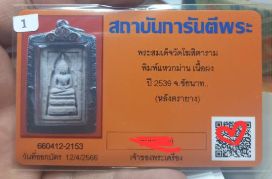 พระสมเด็จแหวกม่าน ย้อนยุค ปี 39 หลวงพ่อกวย วัดโฆสิตาราม หลังมีตราปั๊ม พร้อมกรอบเงินลงยา บัตรG