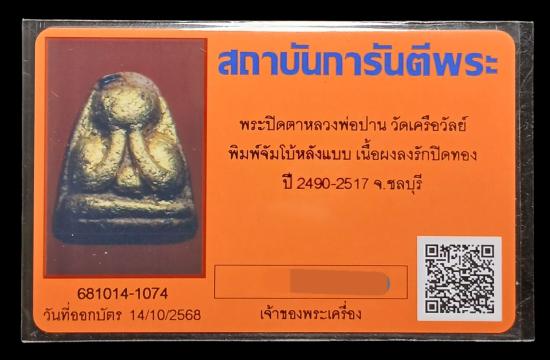 เคาะเดียว...ปิดตาหลวงพ่อปาน วัดเครือวัลย์ ชลบุรี พิมพ์จัมโบ้หลังแบบ เนื้อผงลงรักปิดทอง ปี 2490-2517 พระสวยครับแท้ดูง่าย พร้อมบัตรรับรองจากทางเว็บ |