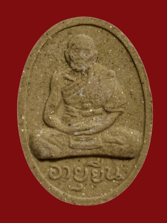 ด้านหน้าพระผง เป็นรูปเหมือนหลวงปู่นั่งเต็มองค์ ด้านล่างเขียนว่า "อายุยืน" เป็นลายเส้นนูน ที่สังฆาฏิ มีอักขระขอมอ่านว่า "อะ นะ อะ"
