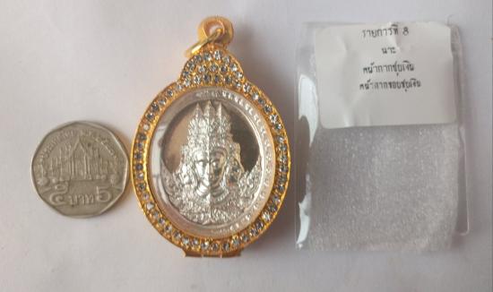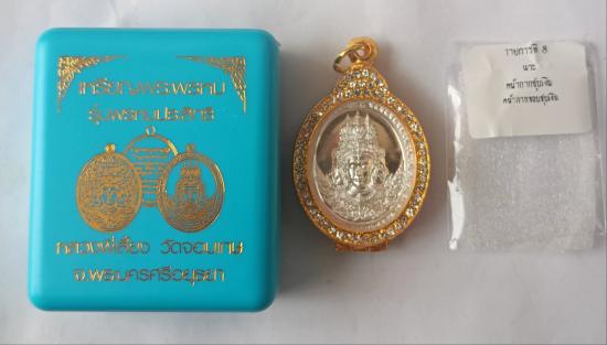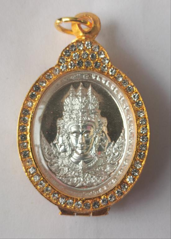 วัดใจเคาะเดียวแดงจ้า เหรียญพระพรหม พระอาจารย์เลี้ยง วัดจอมเกษ เนื้อนวะหน้ากากชุบเงิน หมายเลข2222 พร้อมตลับทองอิตาลี ฝังเพชร เคาะเดียวแดงจ้า |