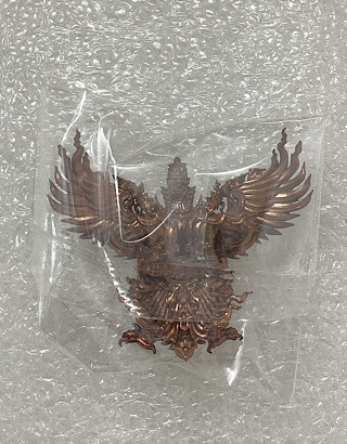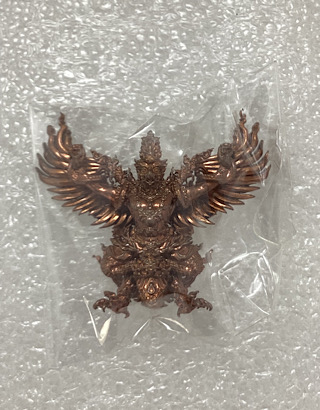 พญาครุฑทรงฤทธิ์ ชนะมาร วัดครุฑธาราม พระนครศรีอยุธยา พิมพ์เล็ก สูง 3.2 ซ.ม. เนื้อทองแดงขัดยาดำ (แจกในพิธี) |