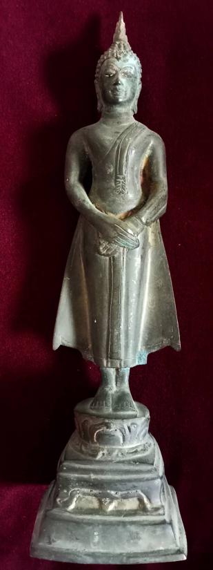 พระบูชา ปางถวายเนตร ขนาดสูงประมาณ 12 นิ้ว ตามุก ประทับยืนบน ฐาน 4 เหลี่ยม มีบัวคว่ำบัวหงายบนโต๊ะขาสิงห์ หล่อสองถอดแต่เชื่อมติดกัน เนื้อทองเหลืองเก่าคร่ำ เกิดสนิมหยกขึ้นประปรายบริเวณพระพักตร์และชายจีวร ใต้ฐานเห็นเศษดินฝรั่ง สภาพเก่าหลายสิบปีสวยตามรูป ส่งฟรีทั่วไทย รับประกันตามกฎครับ |