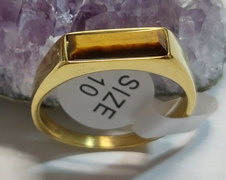 แหวนหัวไทเกอร์อายหรือหินตาเสือ ตัวเรือนแหวนเป็นสแตนเลสงานเลเซอร์ทองแข็งแรงทนทาน ขนาดแหวนเบอร์10 |