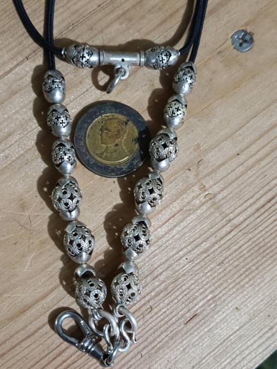 สร้อยเม็ดเงินแท้เก่า สั่งทำ ยาว 36 นิ้วสวมหัวได้ หนัก 23 กรัมกว่า สวยสมบูรณ์ แขวงพระด้านหลังได้