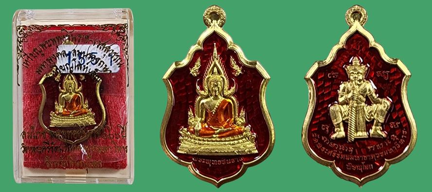 เหรียญโล่ห์พระพุทธชินราช หลังยันต์วิเศษอกเลาโภคทรัพย์ เนื้อทองทิพย์ลงยาสีแดง รุ่น สมโภชพระพุทธชินราช ครบ ๖๖๖ ปี
