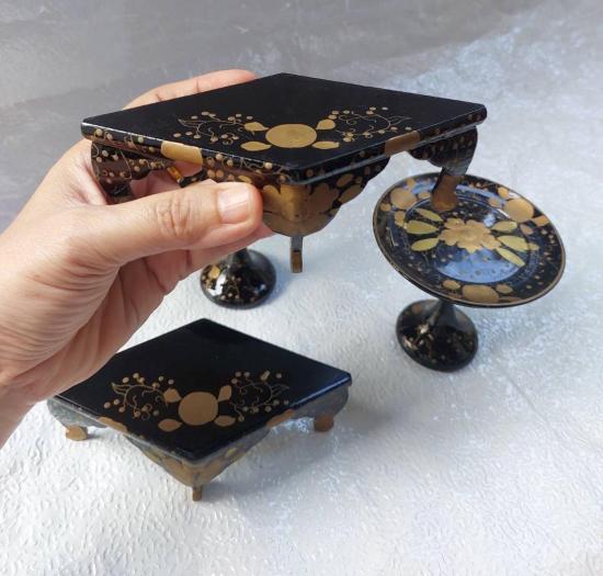 ชุดเครื่องบูชาขนาดเล็ก 4 ชิ้น เครื่องเขินญี่ปุ่น (ชิกกิ) ขนาดเล็ก ซึ่งตกแต่งด้วยเทคนิคที่เรียกว่า มากิเอะ (Maki-e) |