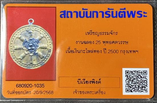 วัดใจของหายาก เหรียญธรรมจักร งานฉลอง 25 พุทธศตวรรษ เนื้อเงินกะไหล่ทอง ปี 2500 กรุเทพฯ พร้อมบัตรรับรอง