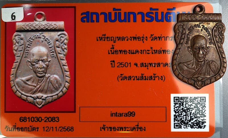 เหรียญหลวงพ่อรุ่ง วัดท่ากระบือ เนื้ิอทองแดงกะไหล่ทอง พ.ศ. 2501 จ.สมุทรสาคร (วัดสวนส้มสร้าง) พร้อมบัตร G-Pra |