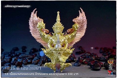 พญาครุฑเสาร์5 เงินไหลมา วัดพระมหาธาตุวรมหาวิหาร จ.นครศรีธรรมราช เนื้อทองพระนคร ปีกทองแดง พระธาตุทองขาว ขนาด 4.3 ซ.ม. ซีลเดิมยังไม่ได้แกะ |