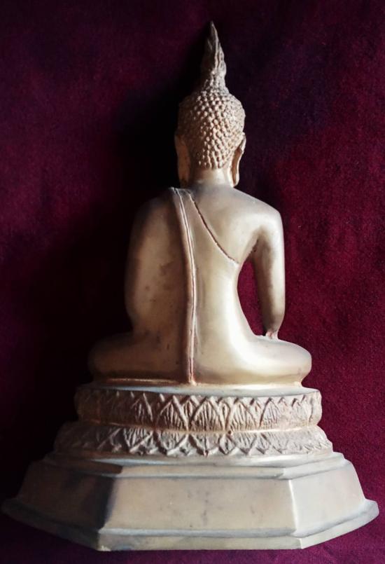 พระบูชา ปางมารวิชัย ขนาดหน้าตักประมาณ 4.5 นิ้ว ประทับนั่งบนผ้าทิพย์ ฐานบัวฟันปลาคว่ำบัวหงายงาม ๆ เนื้อทองเหลืองหล่อค่อนข้างหนาหนัก สีเริ่มออกคล้ำ ใต้ฐานมองเห็นดินฝรั่งและแกนลวดหุ่นพระในองค์พระ ดูเก่าดี สภาพสวยตามรูป ส่งฟรีทั่วไทย รับประกันตามกฎครับ |