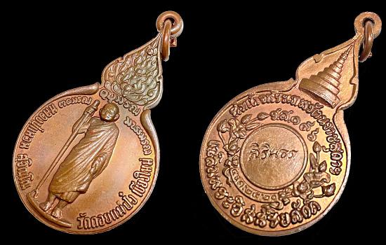 เหรียญทองแดงใหญ่ยืนถือไม้เท้าหลัง พระฉายาสิรินธร หลวงปู่แหวน วัดดอยแม่ปั๋ง ปี 2520 |