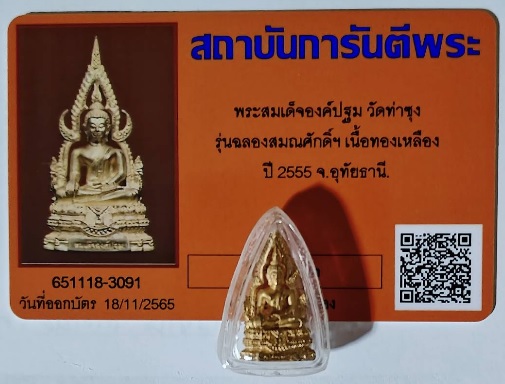 สมเด็จองค์ปฐมฯ รุ่นที่ระลึกฉลองฉลองสมณศักดิ์พระภาวนากิจวิมล 2555 วัดท่าซุง เนื้อทองเหลือง พร้อมบัตรรับรองพระแท้ |