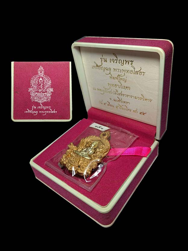 เหรียญฉลุ 3 ชิ้น พระพุทธโสธร รุ่น เจริญพร เนื้อบรอนซ์แก่ทองคำองค์เงิน พิมพ์ใหญ่ หมายเลข 151 สร้างน้อยเพียง 444 องค์ พุทธาภิเษก ณ พระอุโบสถวัดโสธรวรารามวรวิหาร จ.ฉะเชิงเทรา วันที่ 5 เดือน 5 ปีมะโรง ศก 55 พร้อมกล่องเดิม