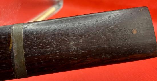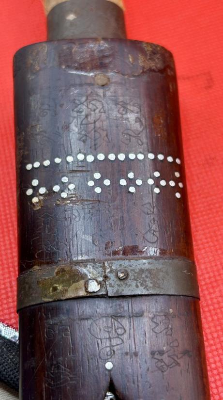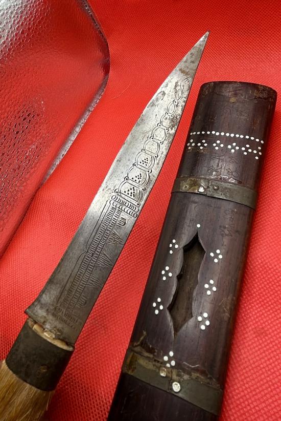 100 บาทครับ มีดหมอ เล่มใหญ่ ใบเหล็กตอกลาย ด้ามเป็นเขา ฝักไม้ ลงอักขระ เก่ามากครับ