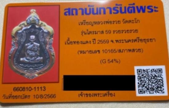 เหรียญหลวงพ่อรวย วัดตะโก รุ่นไตรมาส59 รวย รวย รวย เนื้อทองแดงปี2559 จ.พระนครศรีอยุธยา เลข10165 สภาพสวย เลี่ยมทองฝังเพชรcz พร้อมบัตรรับรองG-Pra ระบุพระสวย |