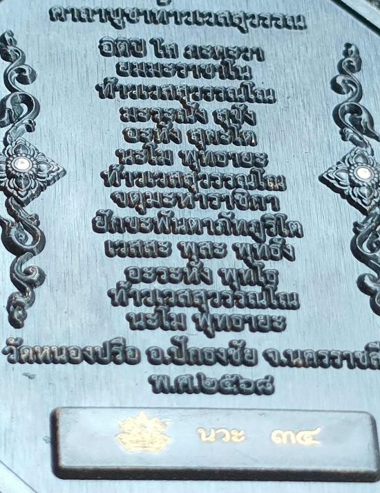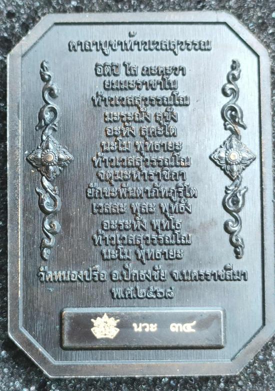 เหรียญท้าวเวสสุวรรณ พิมพ์แปดเหลี่ยม รุ่น"ประทานทรัพย์" วัดหนองปรือ จ.นครราชสีมา เนื้อนวะโลหะ เพ้นท์เต็ม หลังคาถาบูชาท้าวเวสสุวรรณ หมายเลข ๓๔ พร้อมกล่อง (สร้าง 50 เหรียญ) |