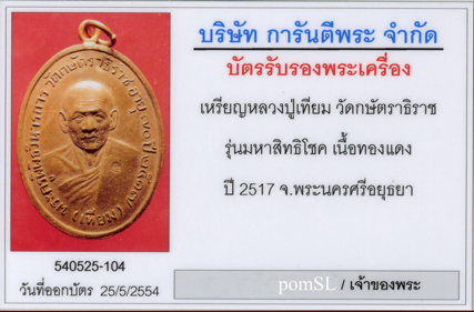 เหรียญหลวงปู่เทียม รุ่นมหาสิทธิโชค วัดกษัตราธิราช มาพร้อมบัตร G ครับ