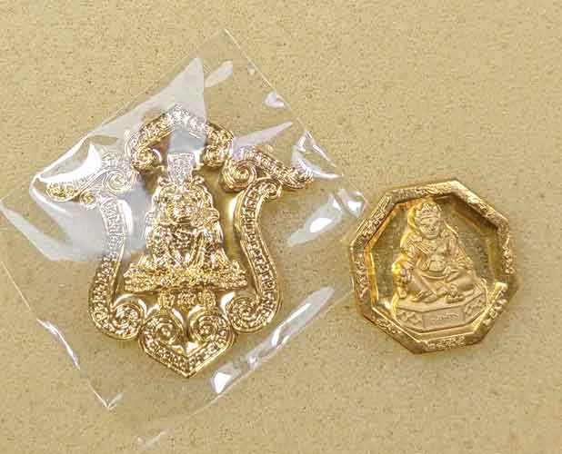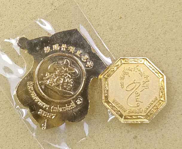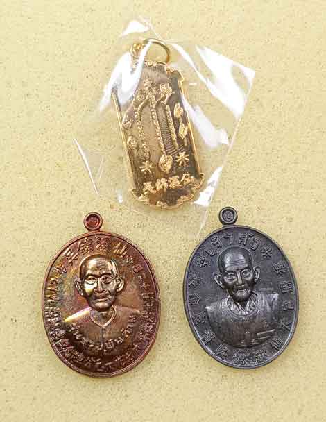 เหรียญเทพเจ้าไฉ่ซิงเอี๊ย 2 เหรียญ + เหรียญอาแปะโรงสี 3 เหรียญ |