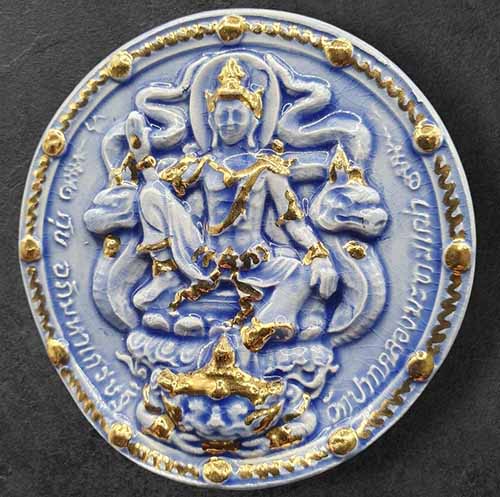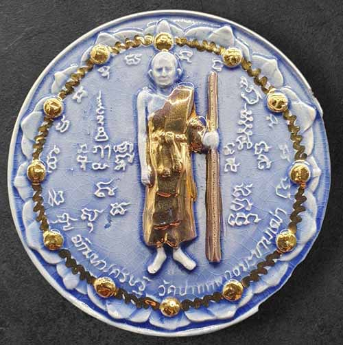 องค์พ่อจตุคาม หลวงปู่ศุข กรมหลวงชุมพร รุ่น ศุข อภิมหาเศรษฐี เนื้อกระเบื้องเคลือบ สีน้ำเงิน + สีเหลือง ลายน้ำทอง ขนาด 5 ซม และ 3 ซม.กล่องเดิม |