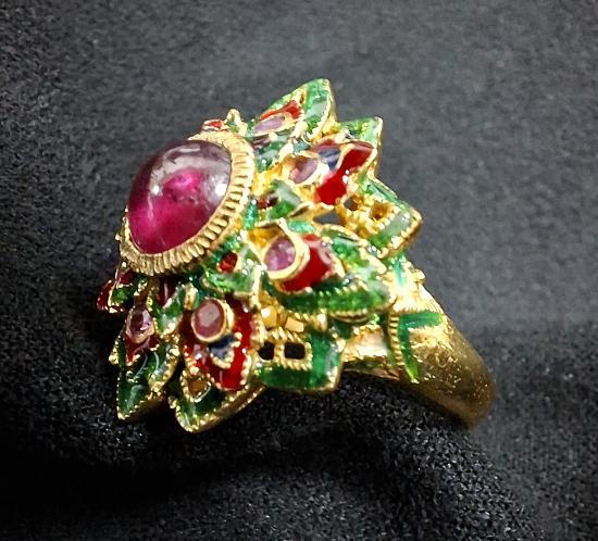 แหวนเงินแท้ 92.5 ตัวเรือนงานขึ้นมือ - ชุบทอง ลงยา - หัวแหวนทับทิม เม็ดล้อมทับทิม - ทรงแก้วเจ้าจอม - ขนาด 53 |