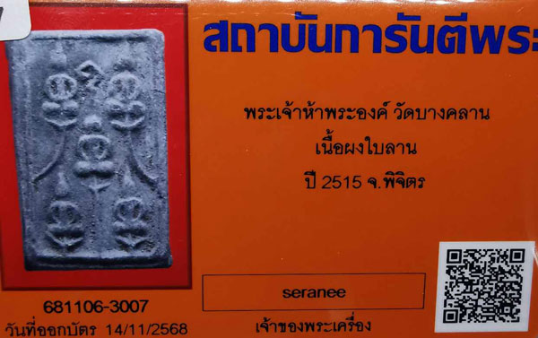 พระเจ้าห้าพระองค์ วัดบางคลาน เนื้อผงใบลาน ปี2515 จ.พิจิตร + บัตรG-pra สภาพเดิมค่ะ |