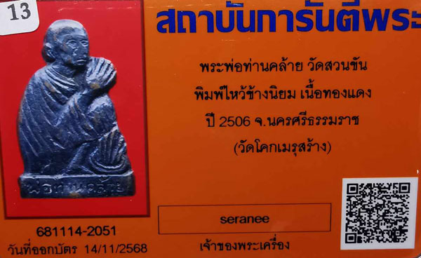 รูปเหมือนพ่อท่านคล้าย วัดสวนขัน พิมพ์ไหว้ข้างนิยม เนื้อทองแดง กริ่งดัง ปี2506 จ.นครศรีธรรมราช (วัดโคกเมรุสร้าง) + บัตรG-pra สภาพเดิมค่ะ พระสภาพตามรูปทุกประการค่ะ