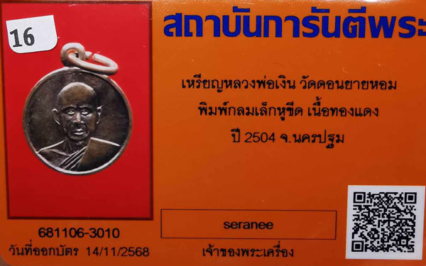 เหรียญหลวงพ่อเงิน วัดดอนยายหอม พิมพ์กลมเล็กหูขีด เนื้อทองแดงผิวไฟ ห่วงเดิม ปี2504 จ.นครปฐม + บัตรG-pra สภาพสวยเดิมค่ะ |