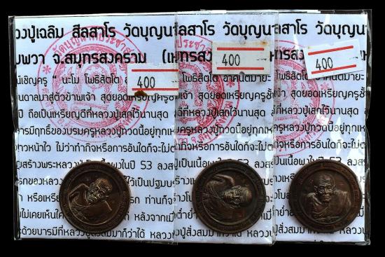 รายละเอียด ชุด 3 องค์...เหรียญหลวงปู่ทวด รุ่นทักษิณาจารย์ 53 เนื้อนวะ เบอร์ ๒ + ๒๕๗ + ๒๕๙ หลวงปู่เฉลิม วัดบุญนาคประชาสรรค์ จ.สมุทรสงคราม พร้อมซองใบฝอยเดิมจากวัด สภาพพระตามรูปทุกประการ (ขนาดประมาณ 2.7 ซม.)