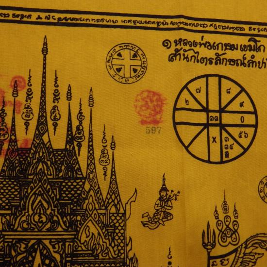 ผืนใหญ่..ขนาด19 X 29 นิ้ว... ผ้ายันต์ครอบจักรวาล 108 หลวงพ่อเกษม รุ่นพุทธคุณ ปี2538 เลข 597 ... 68.9.26 |