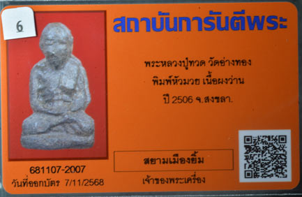 พระหลวงปู่ทวด วัดอ่างทอง พิมพ์หัวมวย เนื้อผงว่าน ปี2506 |