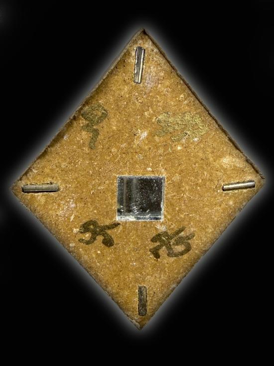 ด้านหลังองค์พระประดับด้วยแผ่นกระจก เป็นคันฉ่องโบราณใช้สะท้อนสิ่งไม่ดี ปราบสิ่งเลวร้าย ข่มคู่แข่ง แผ่นกระจกนี้ผ่านการเสกจากยอดเกจิอาจารย์มามากต่อมาก กันดวงตก แก้ดวงไม่ดี แก้ดวงชงก็ได้