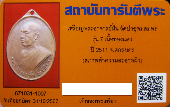 เหรียญพระอาจารย์ฝั้น วัดป่าอุดมสมพร รุ่น 7 เนื้อทองแดง ปี 2511 จ.สกลนคร พร้อมบัตรรับรอง