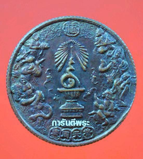--ด้านล่างมีภาษาจีน 9 ตัว หมายถึง งานฉลองครอง 50 ปีเหรียญที่ระลึกการจัดงานนี้มีขนาดเท่ากับเหรียญปราบฮ่อ คือมีเส้นผ่าศูนย์กลาง 3 ซ.ม.หนา 0.25 ซ.ม. จัดได้ว่าเป็นเครื่องรางที่นิยมในหมู่คนจีนเชื้อสายไทย ส่วนพุทธคุณเด่น ด้านอำนาจวาสนาบารมี ด้านโชคลาภเงินทอง เช่นการเสี่ยงดวง ด้านความเจริญก้าวหน้าเลื่อนยศเลื่อนขั้นตำแหน่งเงินเดือน ด้านปกป้องภูตผีปิศาจสัพพเวสีวิญญาณตายโหง ด้านเสริมโหวเฮ้งบนใบหน้าทำให้มีเสน่ห์คนนิยมชมชอบ ด้านแคล้วคลาดปลอดภัยจากอันตรายทั้งปวง เหมาะกับนักธุรกิจพ่อค้าแม่ขาย งานรับราชการ ดารานักร้องศิลปิน มีบัตรรับรองไม่ต้องกลัวปลอมครับนานๆจะมีมาให้เห็นสักเหรียญครับ lสำหรับการบูชา "แปดเซียน โพวเทียนตั่งเข่ง" จะช่วยในด้านความเจริญรุ่งเรือง โชคลาภจากการเสี่ยงดวง ช่วยในด้านอำนาจวาสนาบารมีเกิดความเจริญรุ่งเรืองก้าวหน้าในหน้าที่การงาน มียศถาบรรดาศักดิ์ ได้เลื่อนยศตำแหน่งไประดับที่สูง การปกครองบริวารลูกน้องเกรงกลัวให้ความเคารพนับถือ ช่วยด้านการทำธุรกิจค้าขายจนได้เป็นเศรษฐี ช่วยเรื่องการป้องกันโรคภัยไข้เจ็บ ทำให้สุขภาพดี มีอายุยืน |