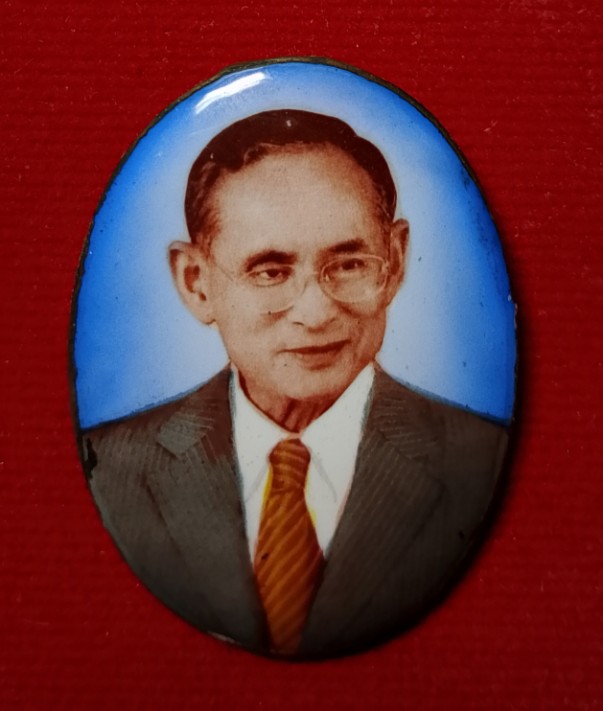 ด้านหน้าเป็นพระบรมรูปในหลวงรัชกาลที่ 9 ทรงสูทแบบสากล, ด้านหลังปิดด้วยแผ่นทองคำ เงิน หรือโลหะ และบรรจุมวลสารมหามงคล