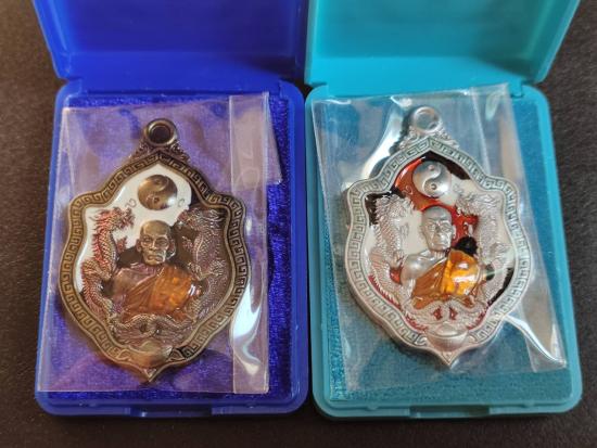 เหรียญมังกรคู่ จักรพรรดิ์ ๙๙ หลวงพ่อพัฒน์ วัดห้วยด้วน ปี63 ยก2องค์ เนื้อไทยเทเนี่ยมลงยาและเนื้อเงินยวงลงยา |